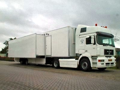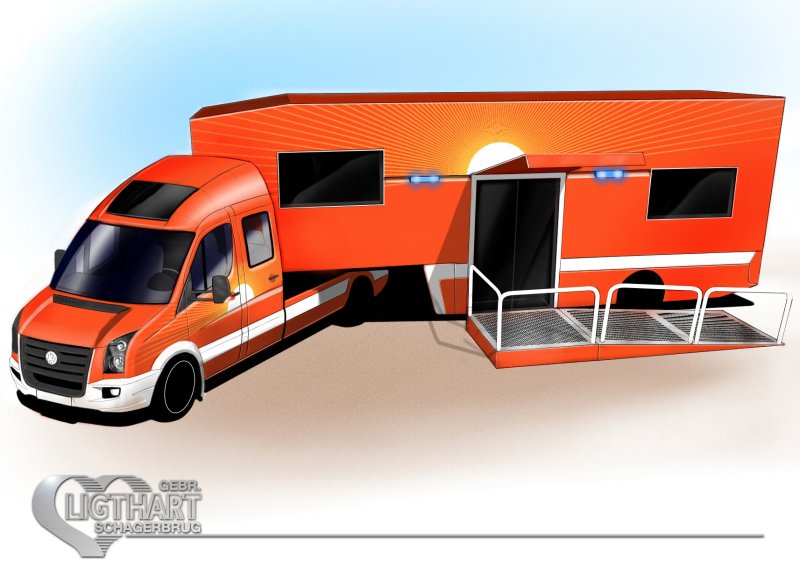 Multi space Medi-trailer 2 zijden in breedte uitschuifbaar. Opsteltijd 1 persoon : 15 minuten.