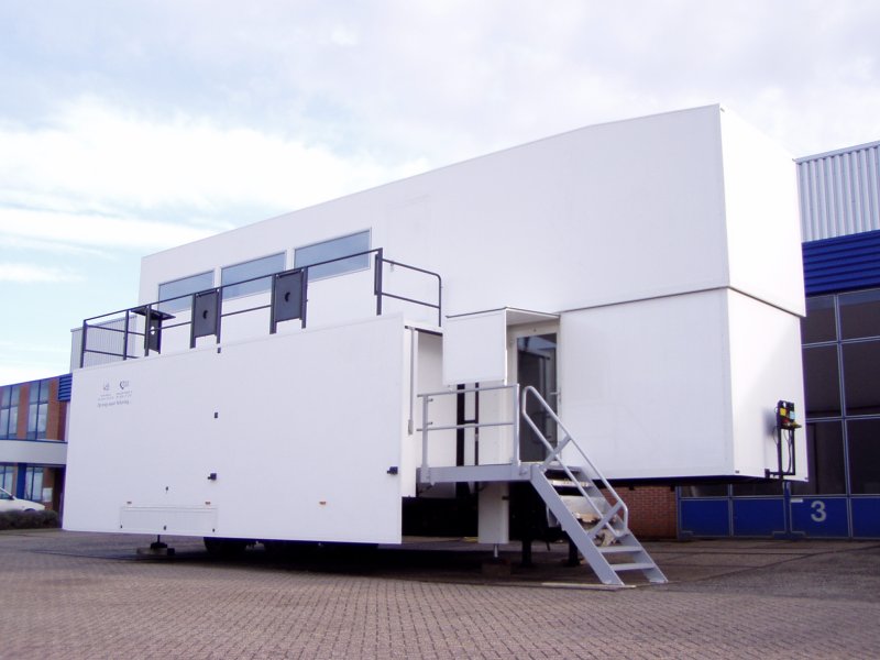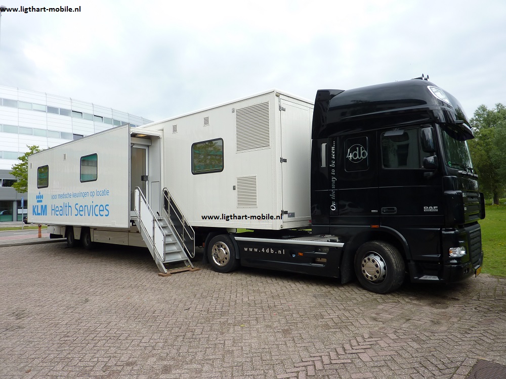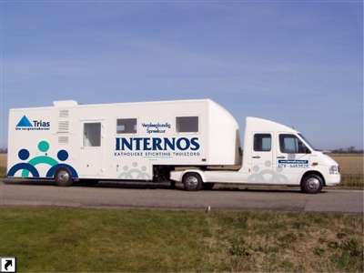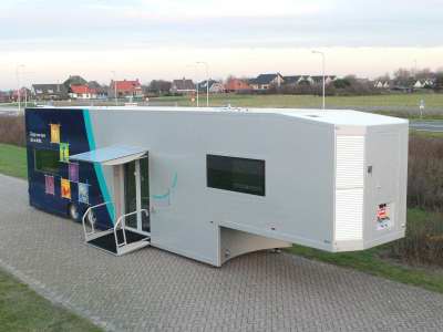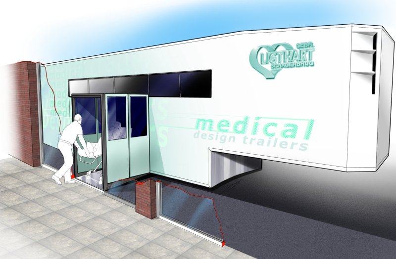 Meditrailer voor groot rijbewijs, lengte naar keuze. Meditrailer low deck : zeer goede toegankelijkheid, ook voor ouderen en minder validen, opstaphoogte 19 cm. Geen trappen nodig, automatische entree deuren, superieure klimaat beheersing, model kan zowel extern als intern geheel naar uw wensen gemaakt worden. Leverbaar voor klein en groot rijbewijs.