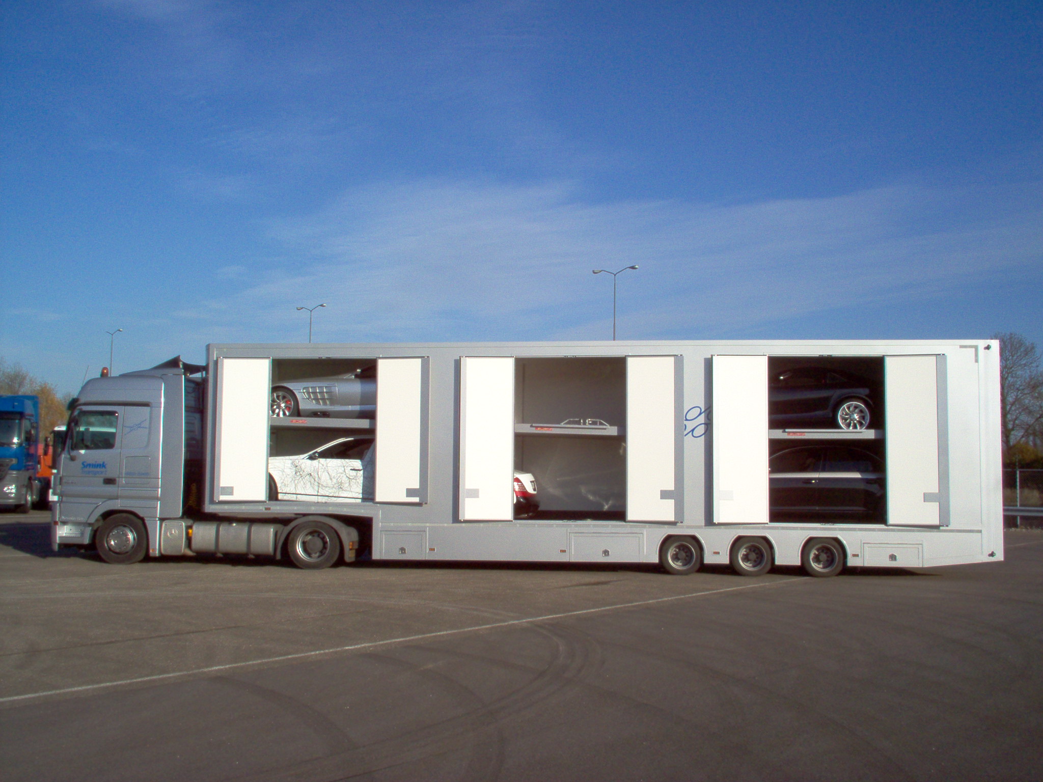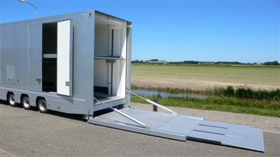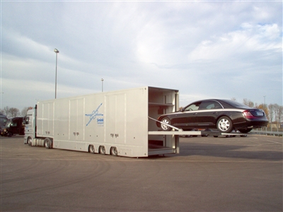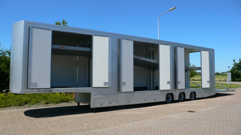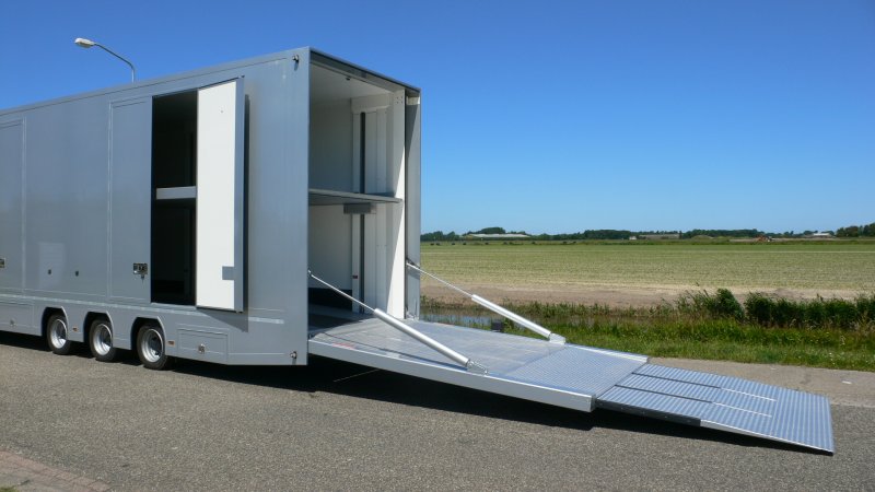 Autotrailers met op de millimeter nauwkeurig in hoogte en helling verstelbare binnenvloeren, onafhankelijk van elkaar werkend, 6 cm dikte, ook tot slechts 2 cm dikte leverbaar, werking middels druk op de knop. Inwendige lengte 14,15 mtr, inwendige hoogte 3,23 mtr , kijk en vergelijk dit goed aub, bij ons technische voorsprong. Bij ons bent u rechtstreeks in contact met de fabrikant zelf : ligthart, 134 jaar ervaring.
